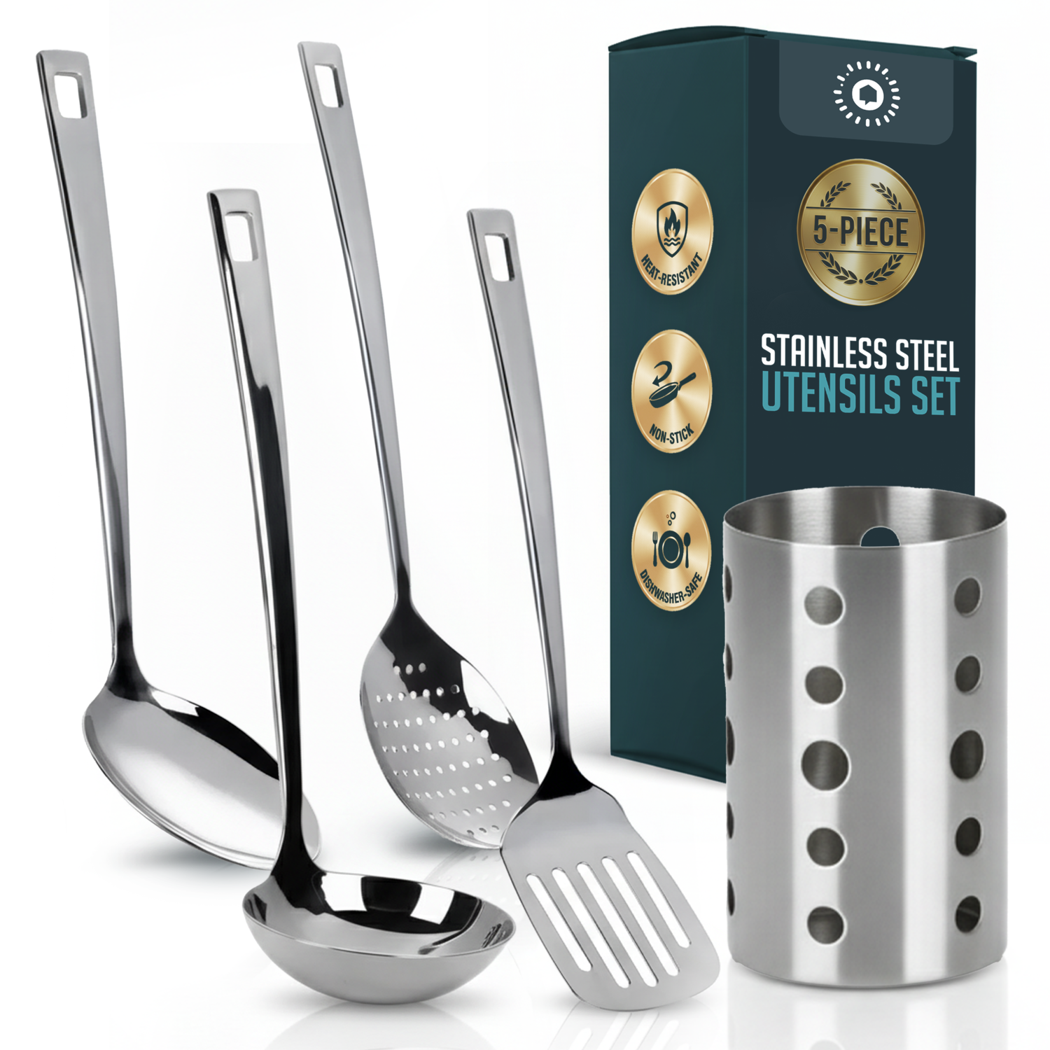 Elevate your kitchen with this Stainless Steel Kitchen Utensil Set with Holder, a versatile 5-piece collection designed for everyday cooking and long-lasting performance. Crafted from premium stainless steel, this heat resistant stainless steel utensils set includes the essential utensils every home chef needs: a slotted turner for flipping and draining, a solid serving spoon for stirring and serving, a deep soup ladle for hearty meals, a skimmer spoon for straining or frying, and a ventilated utensil holder to keep everything organized. Engineered for durability, these nonstick stainless steel cooking utensils resist rust, warping, and bending, ensuring they maintain their sleek polished finish through years of use. Unlike plastic or wooden utensils, this set offers superior strength while remaining safe for use with nonstick cookware. The ergonomic handles provide a comfortable grip, making it easier to stir, serve, or cook with precision and control. Cleanup is effortless thanks to the dishwasher safe design, saving you time after meals. The included stainless steel holder keeps your tools upright and accessible, featuring drainage holes for cleanliness and a modern look that enhances any kitchen décor. Perfect for family kitchens, new homeowners, or as a thoughtful gift, this stainless steel utensil set combines functionality, style, and durability. Upgrade your cooking experience today and enjoy reliable tools that make preparing meals easier and more enjoyable.