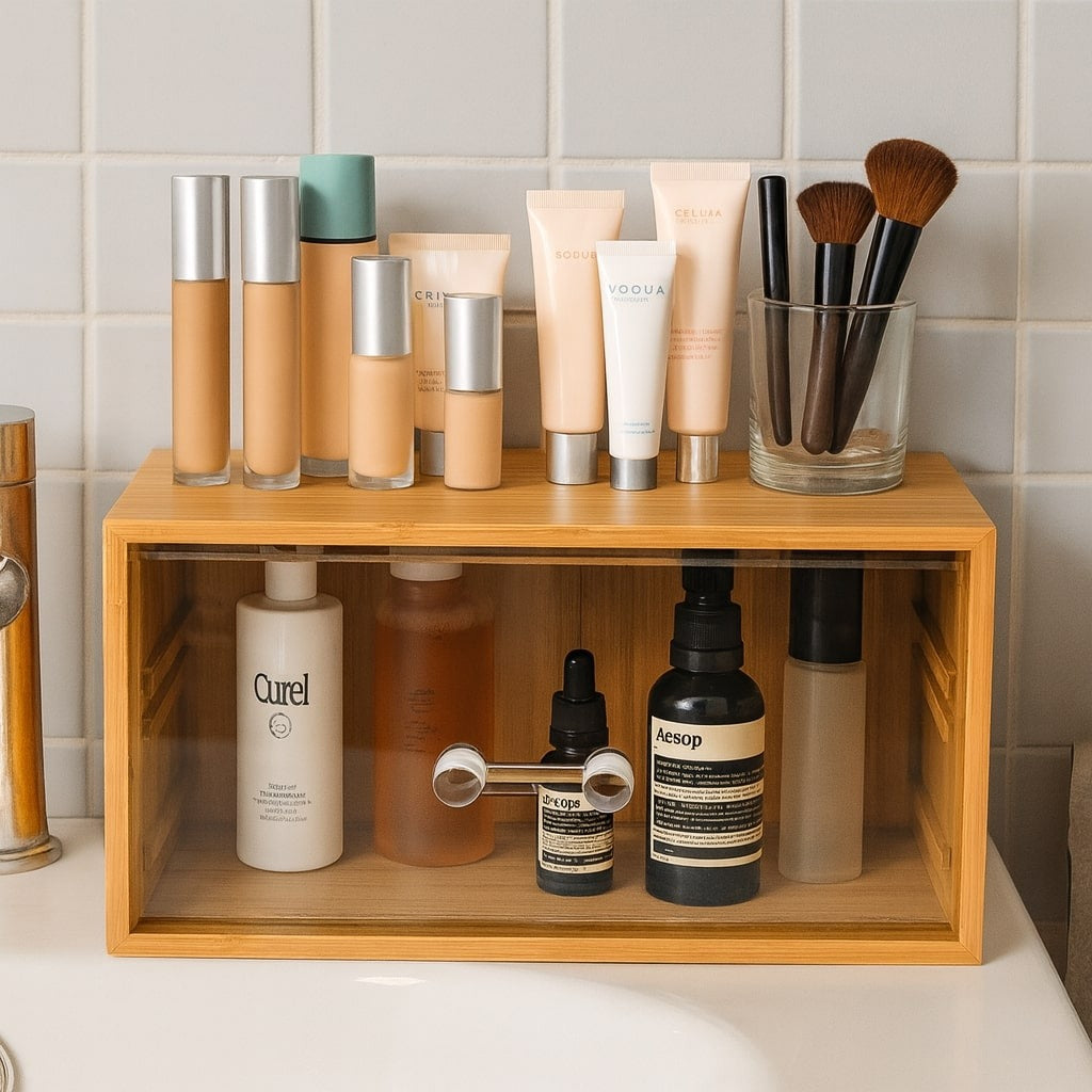 Upgrade your vanity or countertop storage with this modern bamboo organizer featuring a clear acrylic drawer. Designed with a compact yet functional layout, this bamboo storage box offers the perfect solution for keeping your cosmetics, skincare, jewelry, and everyday beauty essentials neatly organized and easy to access. The combination of sustainable bamboo construction with a sleek acrylic drawer creates a durable and stylish design that blends seamlessly with any décor while offering long lasting performance. Crafted from premium bamboo, this bamboo makeup organizer is naturally sturdy, eco-friendly, and resistant to moisture, making it an excellent choice for bathroom counters, bedroom vanities, or office desks. The clear acrylic drawer allows for quick visibility of contents, while the smooth handle provides easy opening and closing. Its nonslip design ensures stability on any surface, preventing sliding or tipping. Perfect as a skincare organizer or jewelry storage box, this piece offers a space-saving solution that maximizes your storage area without clutter. The compact bamboo storage organizer measuring 7.3” x 4.5” x 3.6”H is ideal for apartments, dorm rooms, or minimalist homes seeking functionality with modern style.