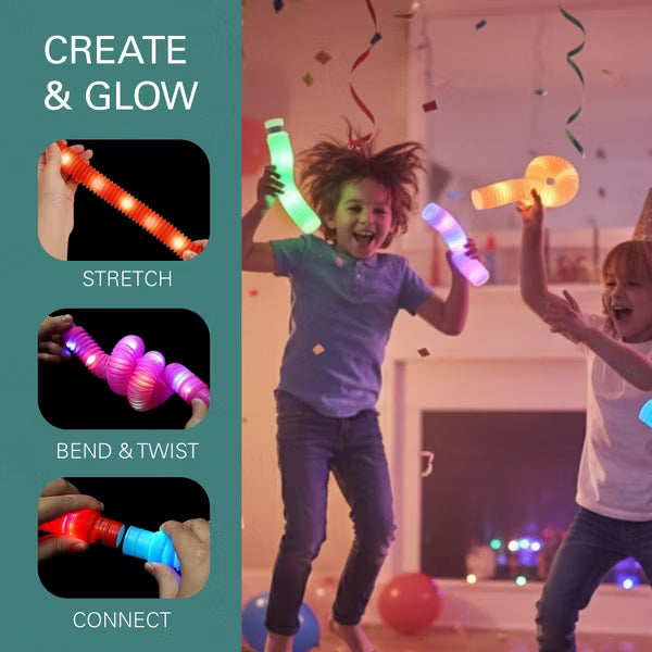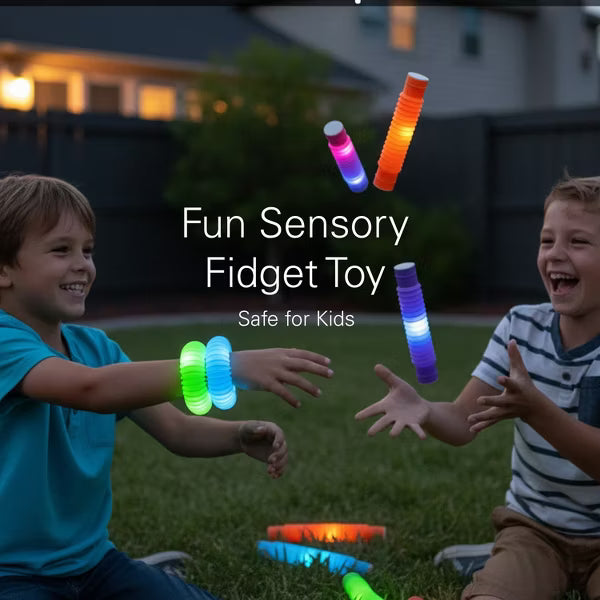 Light up the fun this season with the 12 Pack Christmas LED Light Up Pop Toys, a playful, festive, glowing sensory toy set that brings sparkle, joy, and creativity and gift idea to every celebration. Whether it’s Christmas morning excitement, a cheerful Holiday party, or a spooky Halloween night, these light-up toys make playtime brighter, more magical, and perfect for kids, toddlers, and even adults who love fun fidget toys and glowing gift toys. Each flexible pop tube expands from 7.2 inches to 25 inches, allowing children to connect into wearable glow bracelets, necklaces, and crowns. The lightweight and flexible design makes these Christmas light up pop tube toy easy to connect and create light-up decorations, adding festive fun to any Christmas celebration. The smooth stretch, satisfying pops, and tactile movement help support focus, self-soothing, and sensory regulation while the satisfying “pop” sound adds an extra layer of sensory excitement, making these fidget gift toy set a favorite for playtime, focus, and stress relief and a a great holiday gifts for kids and adults. Made from non-toxic materials, this wearable glow pop tube toy is safe for everyday play. Built with bright LED lights and switch, each glow tube features multiple light modes steady glow, slow flash, and rapid blink lasting up to 8 hours of colorful illumination for nighttime holiday celebrations, sleepovers, glow parties, camping, classroom rewards, birthday parties, family Christmas gatherings or imaginative indoor play. Each tube includes 3 AG13 batteries already installed for instant glowing fun, along with multi-mode LED lighting for added versatility. This 12-pack stretchy twist-and-pop light up pop tube Christmas LED toys makes a festive addition to holiday gift exchanges, stocking stuffers, Halloween goodie bags, birthday party favors, classroom rewards, or cheerful “just because” glowing surprises. A fun, shareable, interactive toy that brings Christmas excitement, family joy, and glowing creativity day or night. Bring the magic of light, sound, and creativity together with this exciting LED sensory toy set. A fun, shareable, and gift-ready favorite for every holiday, Halloween, or Christmas celebration.