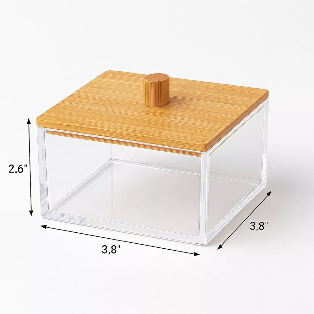 Cosmetic Organizer with Bamboo Lid, Clear Square Nonslip Acrylic Makeup, Cotton Ball & Swab Storage Box, Multi Purpose Vanity Organizer