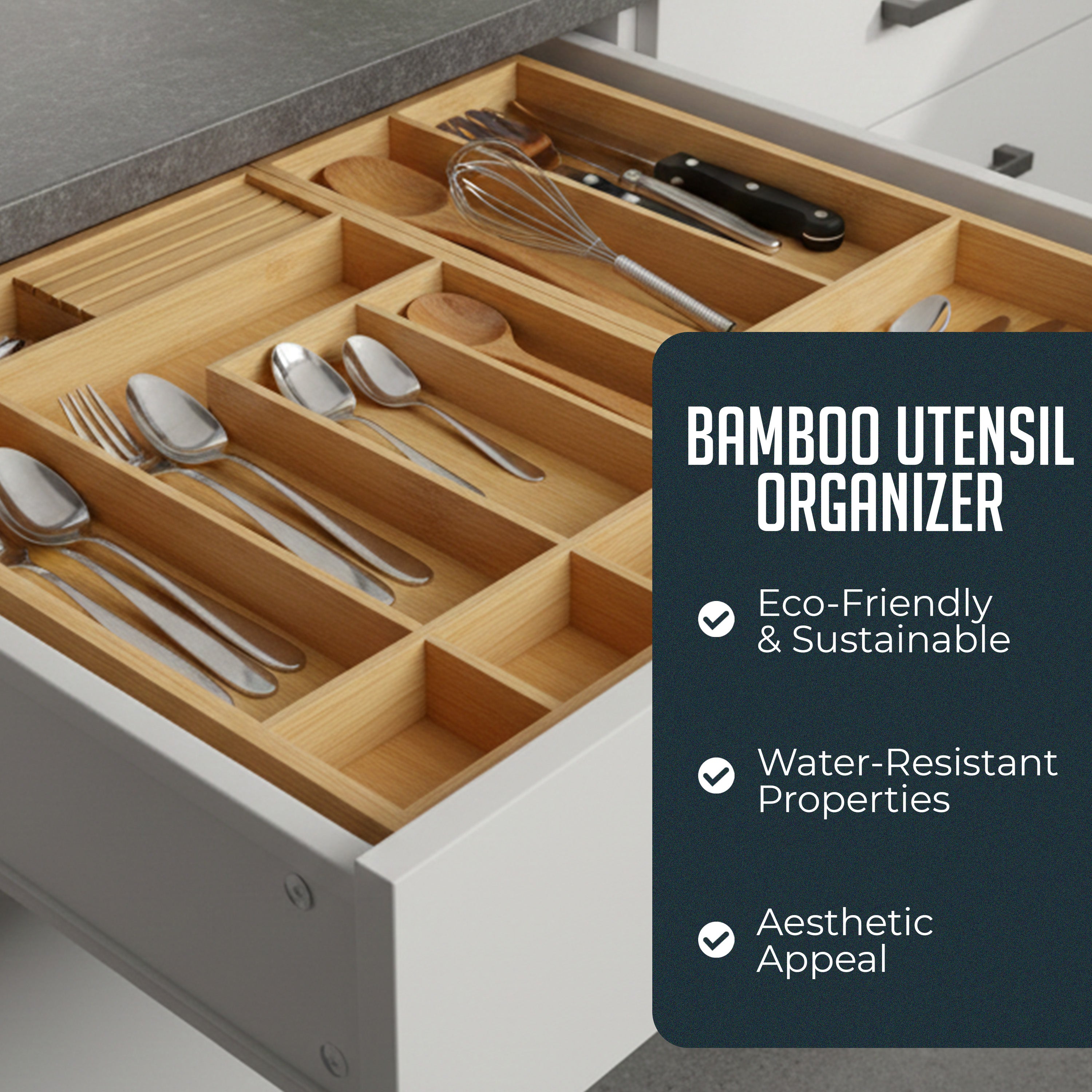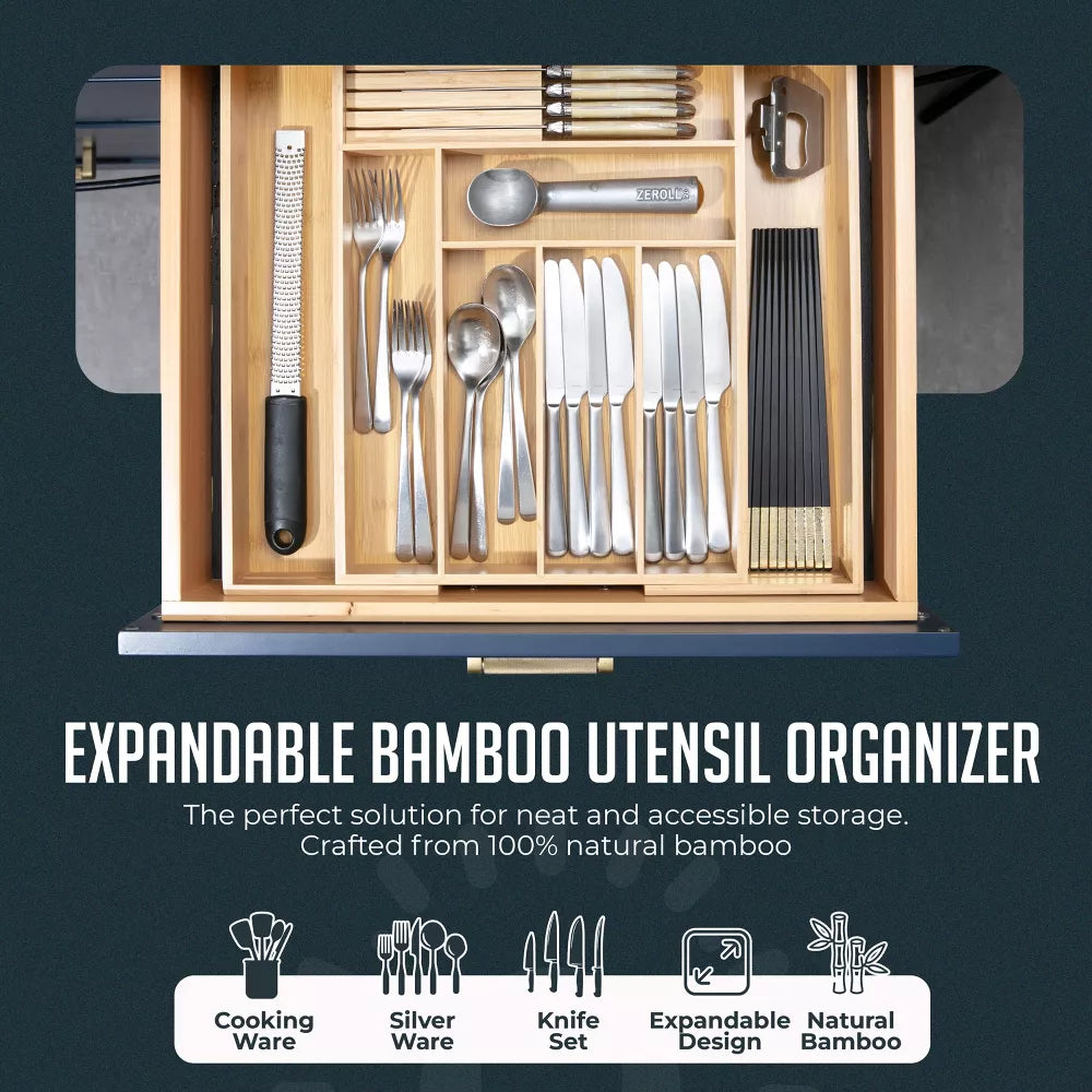 Organize your kitchen in style with the Expandable Bamboo Utensil Drawer Organizer, the perfect solution for neat and accessible storage. Crafted from 100% natural bamboo, this eco-friendly and durable flatware and utensils drawer organizer is designed to keep your cutlery, flatware, utensils, and knives beautifully arranged. Measuring 336mm x 66mm x 438mm, this spacious kitchen flatware bamboo organizer provides ample room to fit your kitchen essentials while maintaining a tidy, clutter-free environment. This expandable nonslip flatware organizer fits a variety of drawer sizes, offering up to seven compartments for maximum storage flexibility. The removable knife block offers a safe and accessible place to store your knives, while the non-slip feet keep this space saving silverware drawer organizer securely in place, ensuring no shifting or sliding when you open and close your drawers. Whether you're storing spoons, forks, knives, or kitchen gadgets, this multifunctional nonslip expandable bamboo organizer adds both elegance and practicality to your kitchen. With its modern wooden finish and expandable storage, it’s the ultimate combination of functionality and style for any home.