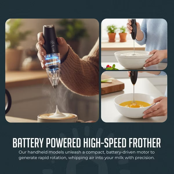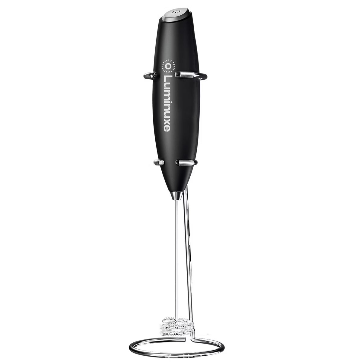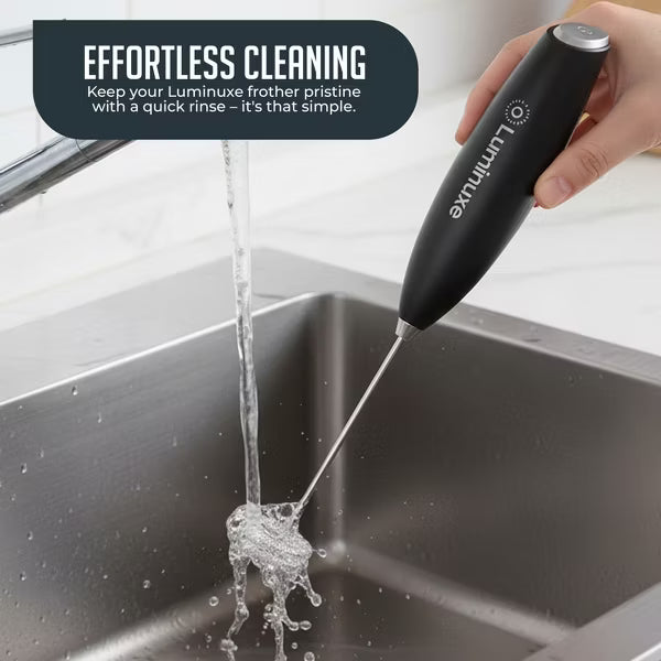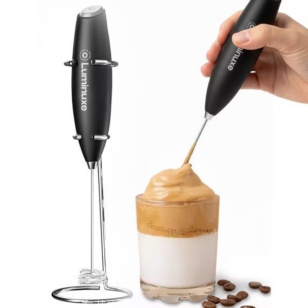 Upgrade your home coffee routine with the Luminuxe powerful handheld milk frother, designed to deliver rich, creamy foam in seconds for barista-level drinks at home. This ultra-fast handheld frother features a high-speed 19,000 RPM motor that whisks milk, creamer, matcha, or hot chocolate into smooth, velvety foam with just a quick press. Perfect for lattes, cappuccinos, macchiatos, iced coffees, protein shakes, and more, this electric milk frother and drink mixer brings professional café results straight to your kitchen. Crafted with a durable stainless steel whisk head mixer and a comfortable, ergonomic handle, this portable handheld frother offers precise blending control and is built for long-lasting daily use. It includes two premium Duracell AA batteries, providing powerful, reliable performance without cords or charging. The compact and lightweight design of this space-saving frother mixer makes it easy to store in a drawer or keep on your countertop using the included metal stand for quick everyday access. Cleaning is effortless, simply place the whisk under warm water and power it on briefly for instant cleanup. Ideal for frothing milk, blending matcha tea, mixing powdered drinks, eggs, sauces, or even small batches of peanut butter, jam, or ketchup, this versatile milk frother is crafted to deliver convenience any time, any where. From morning coffee to evening treats, this handheld drink mixer offers speed, consistency, and quality foam every time. Bring your drinks to the next level with Luminuxe Milk Frother, Matcha Blender, and Coffee Mixer, and enjoy café-quality beverages from home.