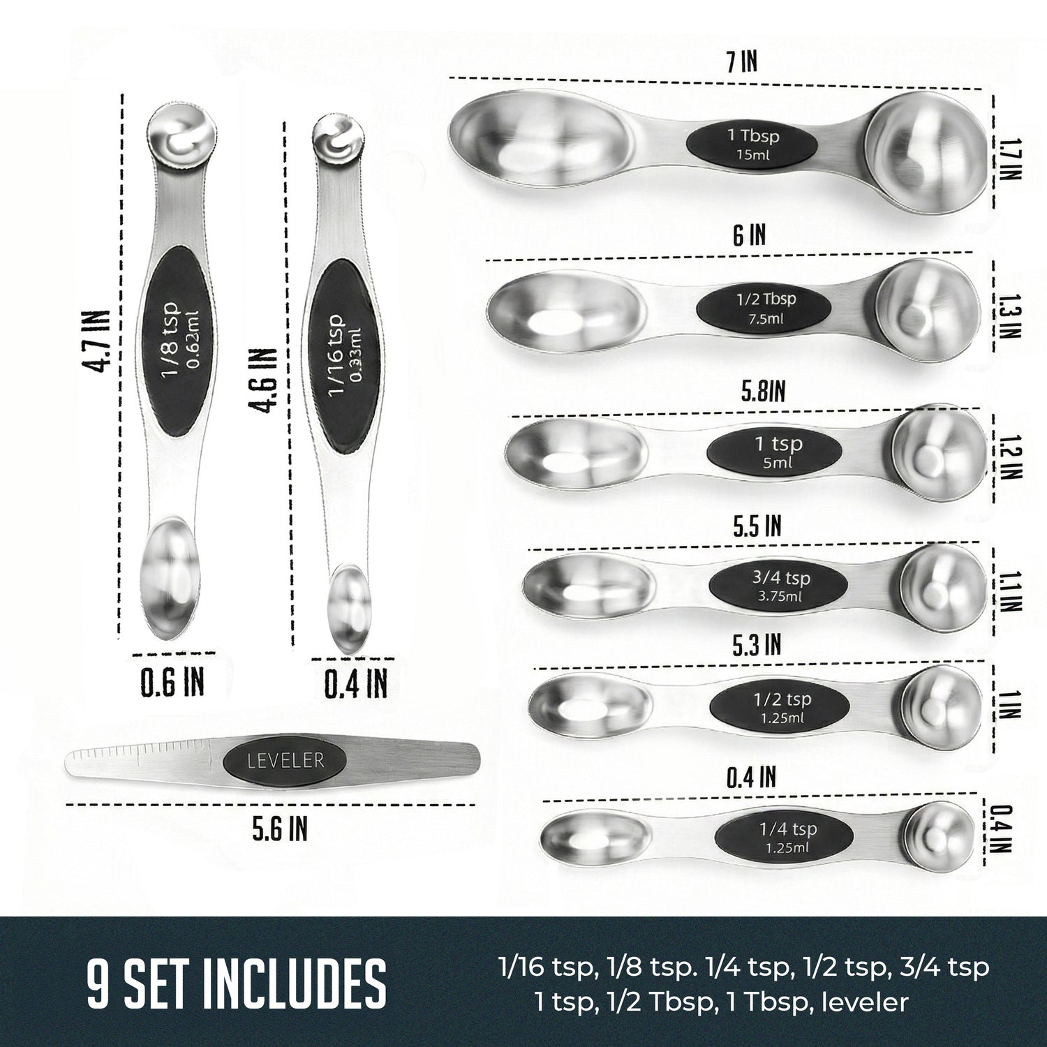 This complete heavy-duty stainless steel measuring spoon set includes the most commonly used sizes: 1/16 tsp, 1/8 tsp, 1/4 tsp, 1/2 tsp, 3/4 tsp, 1 tsp, 1/2 Tbsp, and 1 Tbsp. Whether you are preparing sauces, baked goods, marinades, desserts, or everyday meals, these magnetic spoons enhance efficiency and help keep your workspace organized. Designed for long lasting use, and saves time cleaning with its dishwasher safe feature. This kitchen measuring tool set offers a professional measuring experience for any kitchen. Add this magnetic measuring spoons set to your cooking routine for more accurate and enjoyable meal preparation.