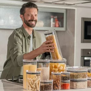 The airtight lids feature secure silicone seals that lock in freshness while protecting ingredients from air and moisture. The modular, stackable design saves space in your pantry, cabinets, or drawers and creates a cohesive, professional look. Whether you’re organizing weekly staples or upgrading your pantry system, this set delivers the perfect combination of functionality, clarity, and style.