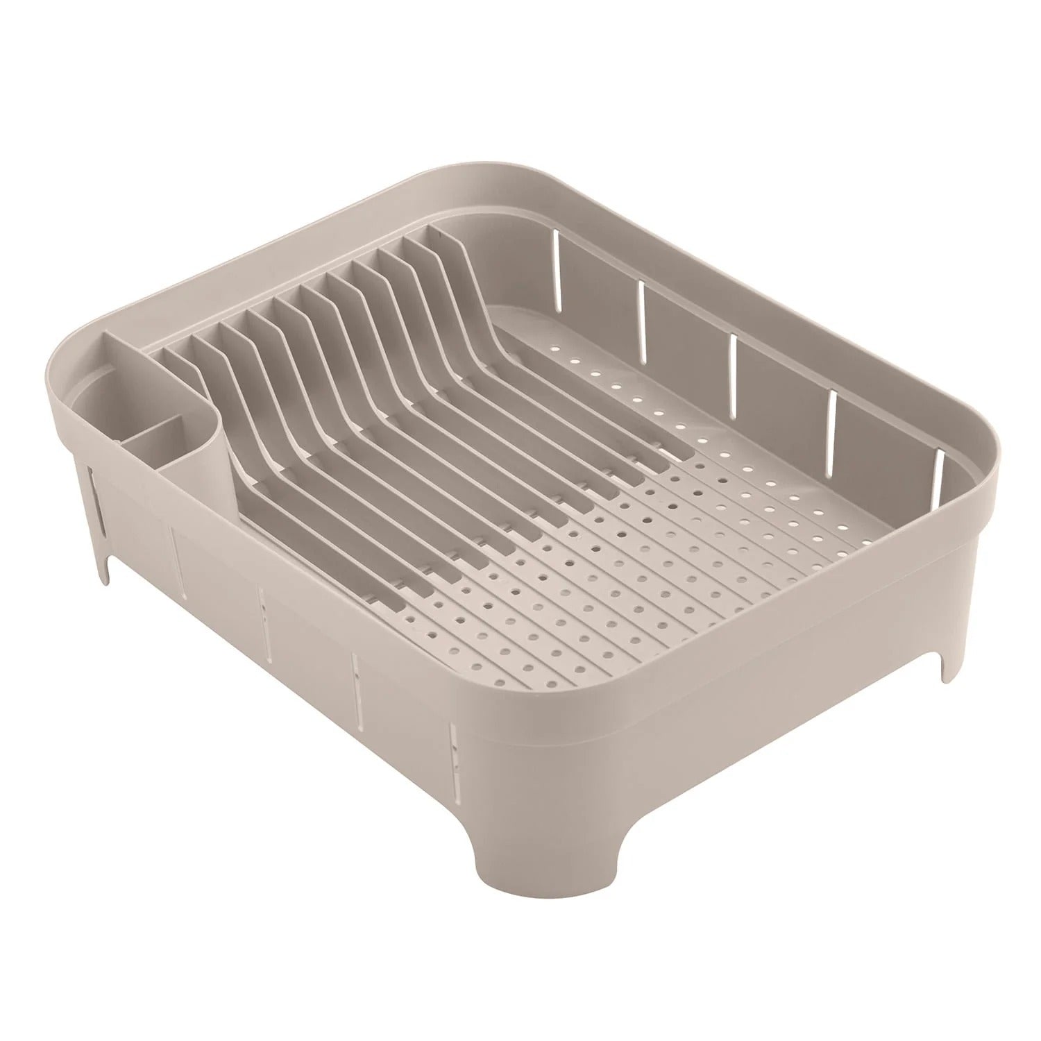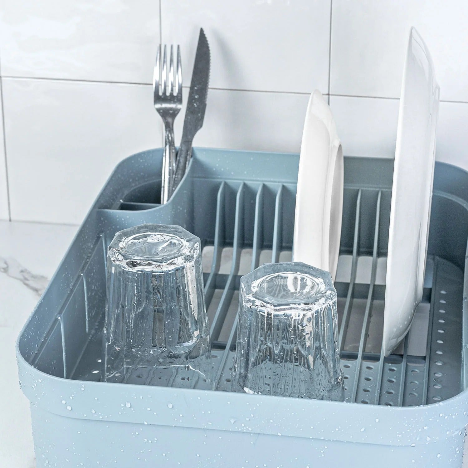 Honestly impressed by how much this drying rack holds. I expected it to be cramped but it fits several plates, some bowls, and utensils without anything toppling over. The separate holder for cutlery is a smart touch, and the plastic material makes cleanup fast. It doesn't slide around and looks neat on the counter.