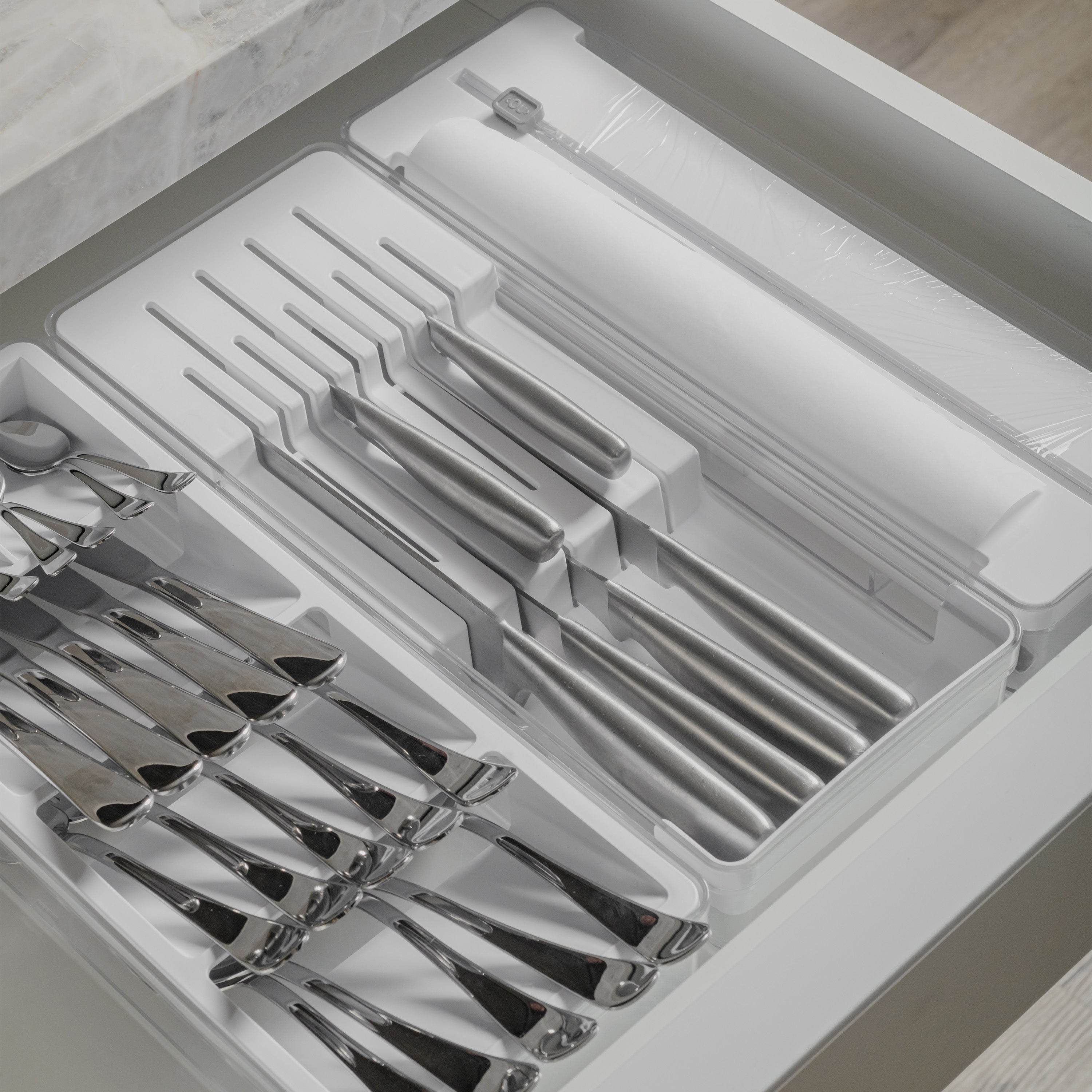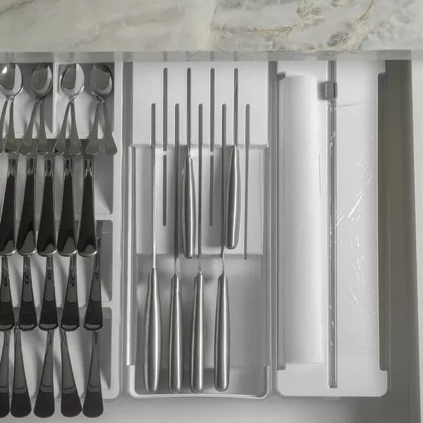 Streamline your kitchen drawers with OU's Kitchen Drawer Organizer Set, designed to bring clean, minimal style and maximum function to your space. This 3-in-1 bundle includes a modular cutlery organizer, knife holder, and dual roll dispenser with cutter, each crafted from high transparency BPA-free plastic for a sleek, uniform look that keeps contents fully visible.