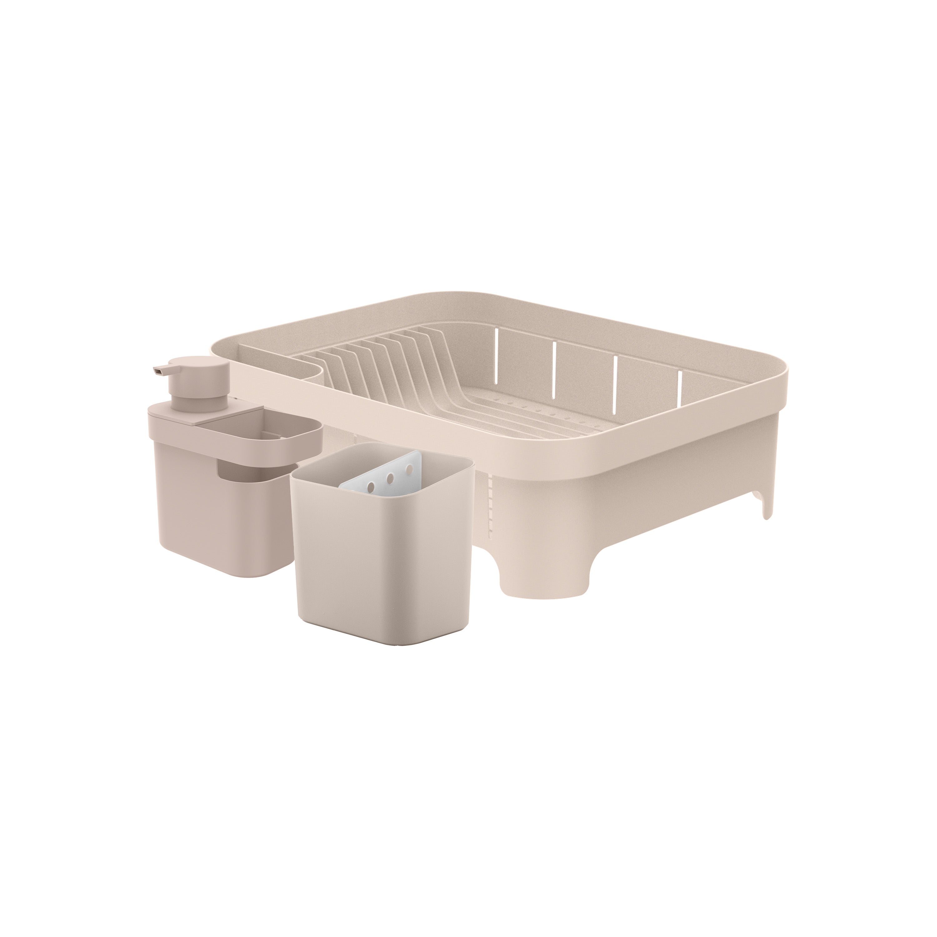 Bring effortless elegance and order to your kitchen with the 3 Piece Sink Organizer Set. This practical yet stylish set includes a 21oz detergent and dish soap dispenser with built in sponge and cloth holder, a dish rack that fits up to 12 plates with space for cups and bowls, and a compact utensil drainer with smart internal drainage and removable divider.