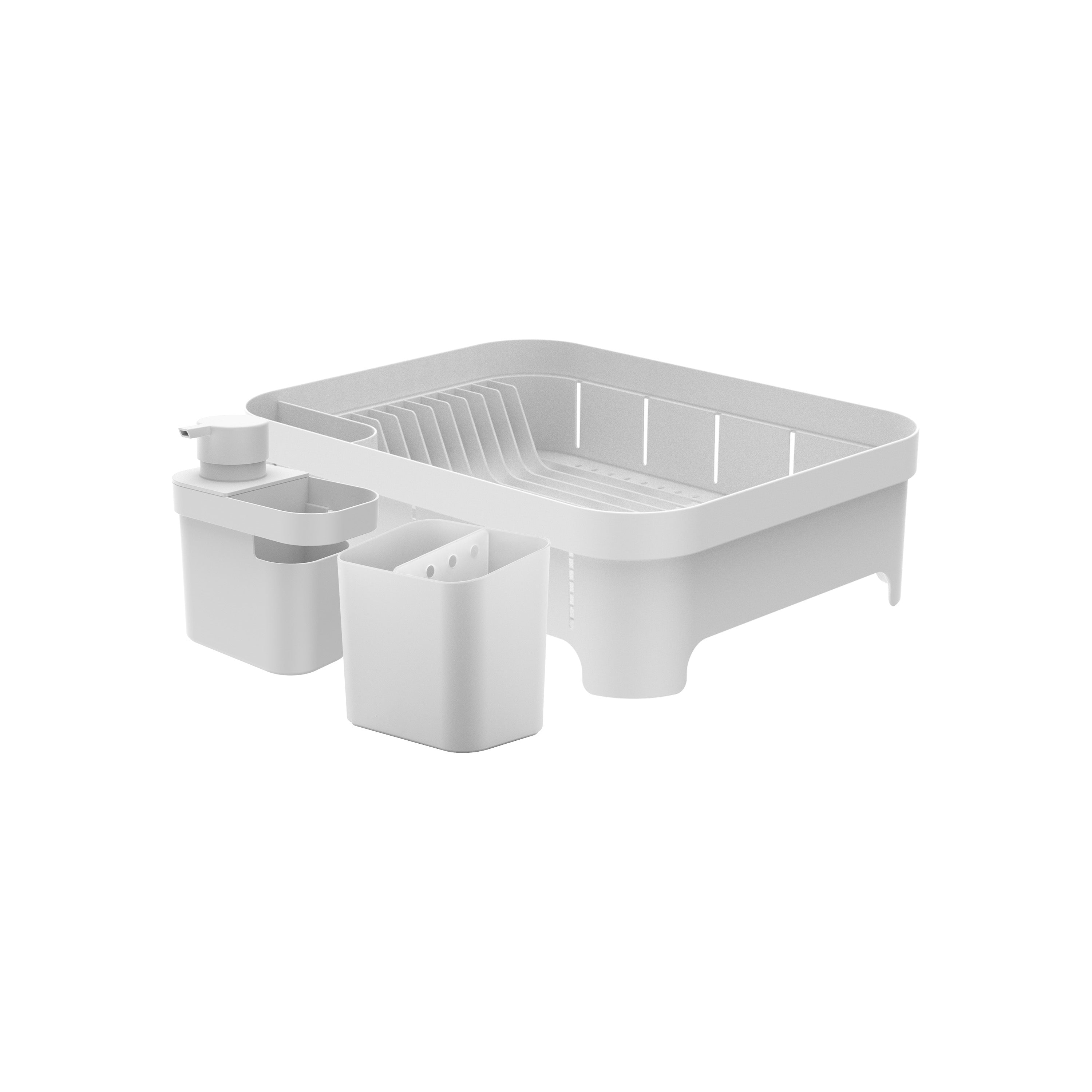 Bring effortless elegance and order to your kitchen with the 3 Piece Sink Organizer Set. This practical yet stylish set includes a 21oz detergent and dish soap dispenser with built in sponge and cloth holder, a dish rack that fits up to 12 plates with space for cups and bowls, and a compact utensil drainer with smart internal drainage and removable divider.