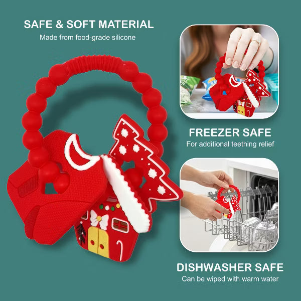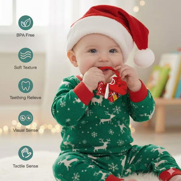 Celebrate your baby’s first holiday season magical with the Adorable Christmas Silicone Teether, a festive favorite that combines charm, comfort, and safety. This Christmas baby teether is beautifully designed with cheerful holiday details including a gingerbread man, Santa, Christmas tree, and gingerbread house charms, capturing the warmth and wonder of the season. Crafted from premium food-grade silicone, this BPA-free silicone teether is completely non-toxic, soft, and chewable perfect for delicate gums. The Christmas themed teething toy features a flexible beaded ring that’s perfectly sized for infant hands, allowing babies to grasp, hold, and chew easily. Its smooth yet textured surfaces gently massage gums, providing safe teething relief while stimulating sensory development and hand-eye coordination. Ideal for infants and toddlers aged 0–18 months, this holiday teether for babies delivers soothing comfort through every teething stage. Parents will love how easy it is to clean, simply rinse with warm water or place it in the dishwasher for quick sanitation. Whether you’re searching for a Christmas teether toy for baby boys and girls or a holiday gift, this soft chewable baby toy doubles as both a practical essential and a charming. Its delightful silicone Christmas design makes it a thoughtful baby teether Christmas gift for newborns, infants, and toddlers. Place it in a stocking, gift basket, or under the tree, a joyful and safe teething toy that brings smiles and comfort all season long.