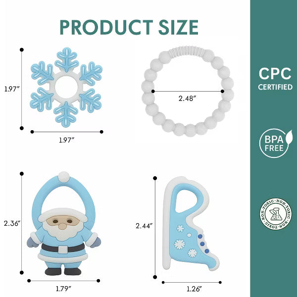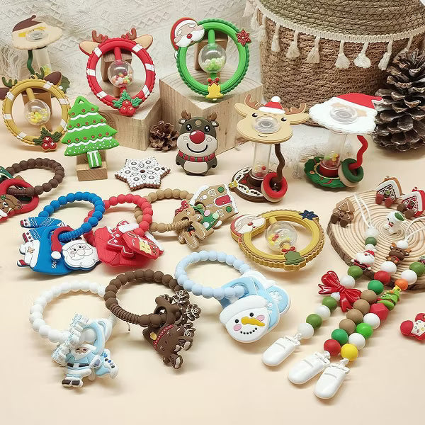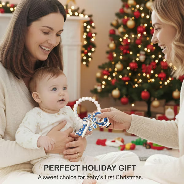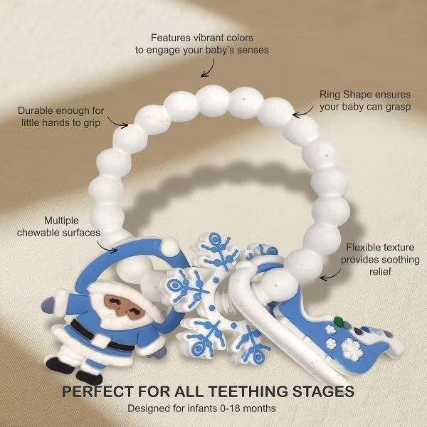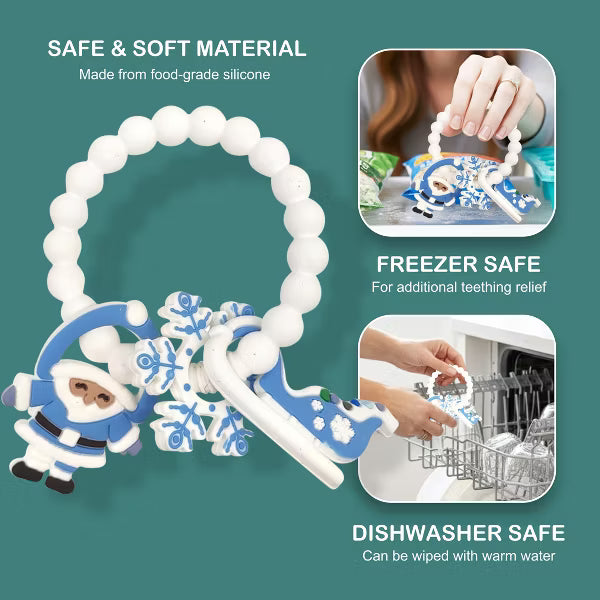 Celebrate your baby’s first holiday season magical with the Adorable Christmas Silicone Teether, a festive favorite that combines charm, comfort, and safety. This Christmas baby teether is beautifully designed with cheerful holiday details including a gingerbread man, Santa, Christmas tree, and gingerbread house charms, capturing the warmth and wonder of the season. Crafted from premium food-grade silicone, this BPA-free silicone teether is completely non-toxic, soft, and chewable perfect for delicate gums. The Christmas themed teething toy features a flexible beaded ring that’s perfectly sized for infant hands, allowing babies to grasp, hold, and chew easily. Its smooth yet textured surfaces gently massage gums, providing safe teething relief while stimulating sensory development and hand-eye coordination. Ideal for infants and toddlers aged 0–18 months, this holiday teether for babies delivers soothing comfort through every teething stage. Parents will love how easy it is to clean, simply rinse with warm water or place it in the dishwasher for quick sanitation. Whether you’re searching for a Christmas teether toy for baby boys and girls or a holiday gift, this soft chewable baby toy doubles as both a practical essential and a charming. Its delightful silicone Christmas design makes it a thoughtful baby teether Christmas gift for newborns, infants, and toddlers. Place it in a stocking, gift basket, or under the tree, a joyful and safe teething toy that brings smiles and comfort all season long.